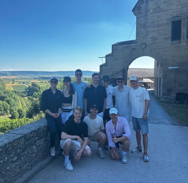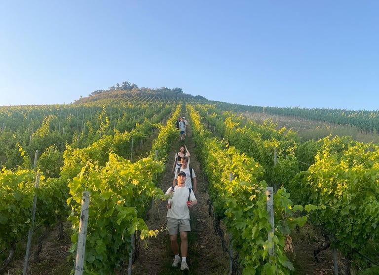Die Wanderung führte uns über Felder, durch Rebhänge und schattige Waldabschnitte. Immer wieder luden Aussichtspunkte und kleine Rastplätze zu kurzen Pausen ein – mit Wein, Snacks und Zeit für Austausch. Insgesamt vier liebevoll vorbereitete Weinstopps sorgten unterwegs für genussvolle Unterbrechungen und trugen dazu bei, dass sich der Tag nie gehetzt, sondern rundum entschleunigt anfühlte. Besonders in Erinnerung bleibt der Halt an der Burg Neipperg: ein traumhafter Ausblick, ein gemeinsames Gruppenfoto und ein kühles Glas Wein im Schatten – ein Moment zum Innehalten und Genießen.